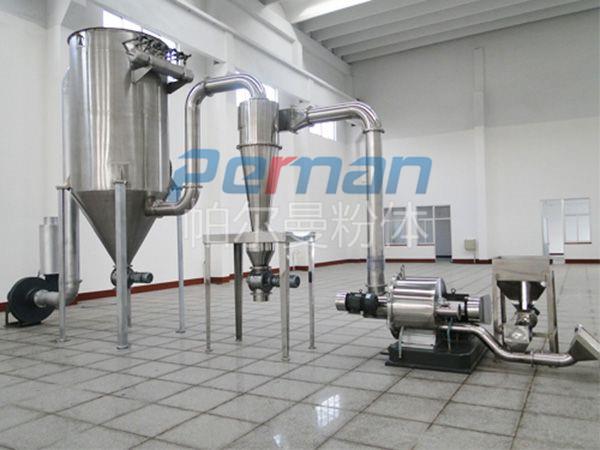 物料由加料系統(tǒng)均勻的送入粉碎室受到高速旋轉(zhuǎn)的粉碎盤的強(qiáng)烈沖擊,同時(shí)受到離心力的作用,與粉碎齒圈發(fā)生碰撞,受到剪切、摩擦、碰撞等多種綜合力的作用,使物料粉碎,被粉碎的物料隨氣流運(yùn)動到分級區(qū),通過變頻調(diào)節(jié)的分級輪,對粗細(xì)物料進(jìn)行分離,符合細(xì)度要求的產(chǎn)品隨氣流進(jìn)入旋風(fēng)收集器和除塵器收集,粗物料返回分級區(qū)二次粉碎。
